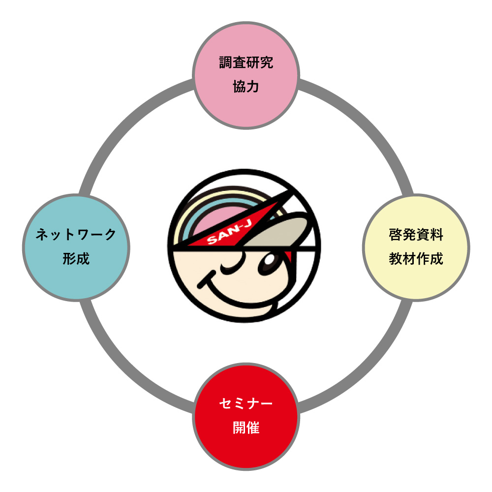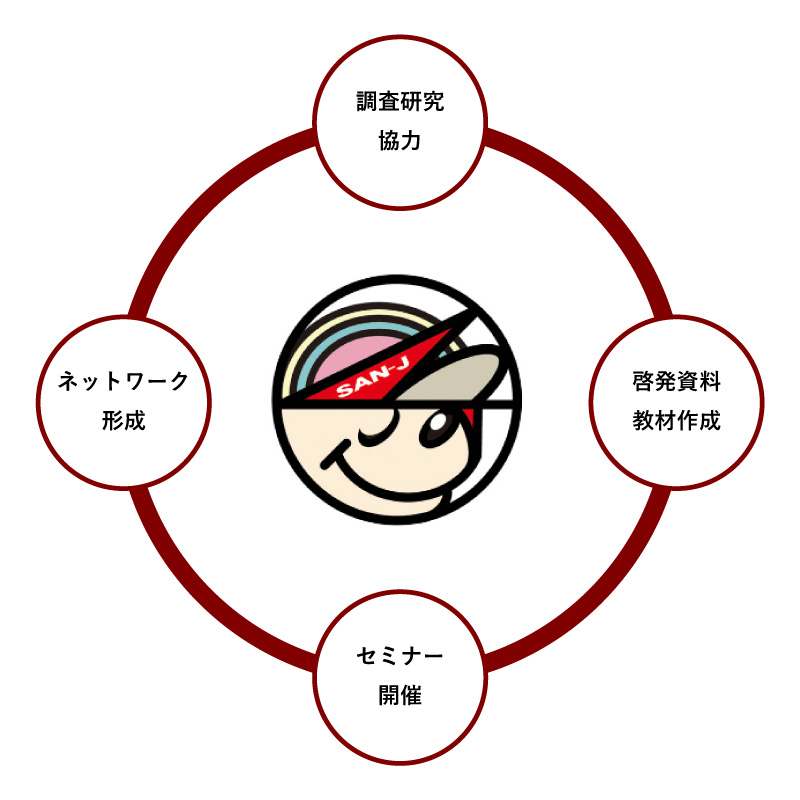SAN-Jの主な活動内容は、調査研究・研究協力、看護ガイドライン等の啓発資料や教材の作成、勉強会の実施と専門職間のネットワーク形成です。2021年よりセミナーを年1-2回開催する予定です。